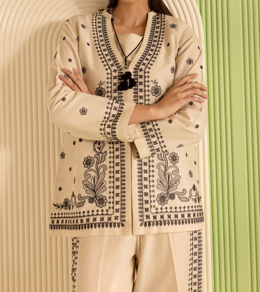 • Embroidered khaddar shrug with hook-and-eye opening & straight-fit sleeves — giving a clean, sophisticated silhouette.