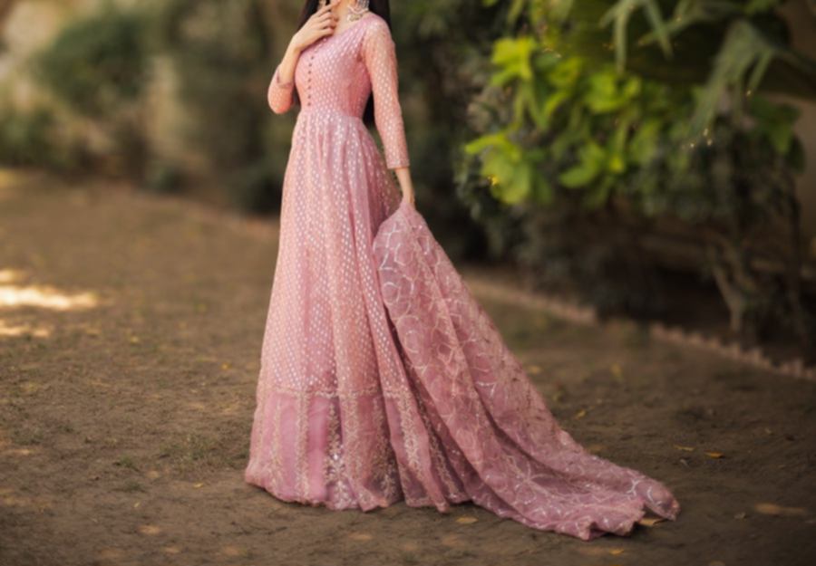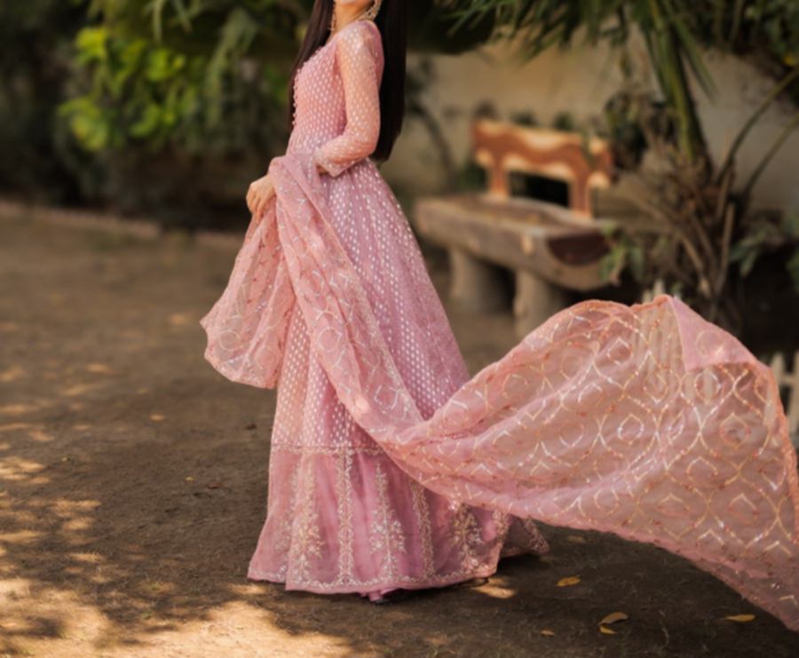 - Dur-e-Adan is a pink pishwas made in zari organza fabric with a shimmer silk lining for a glorious look. The bodice comes with a faux button placket on the front, finished with hand-made golden tissue buttons.