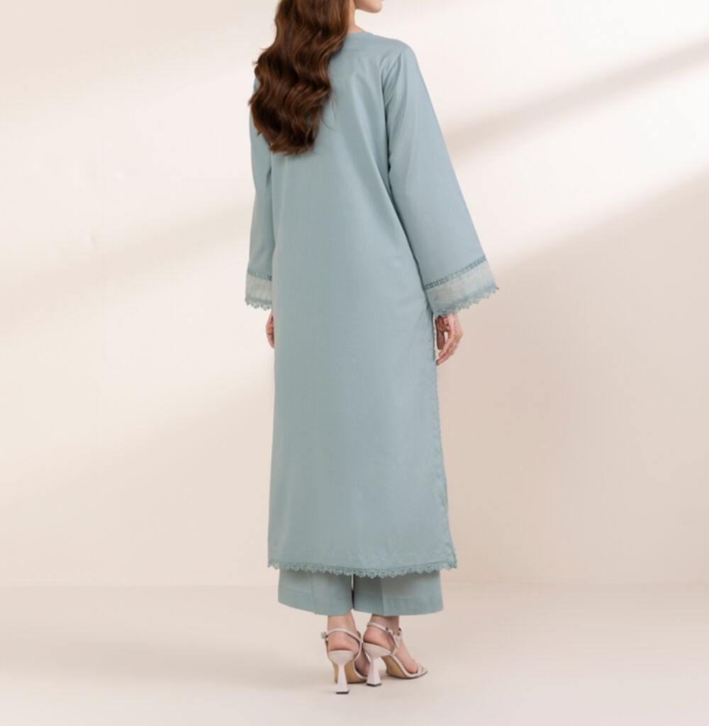 - Step into refined elegance with our Embroidered Blue Dobby A-Line Shirt. Crafted from premium dobby fabric, this A-line silhouette features a dyed and embroidered front panel, dyed back panel, and a delicate lace finish for an elevated feminine touch.