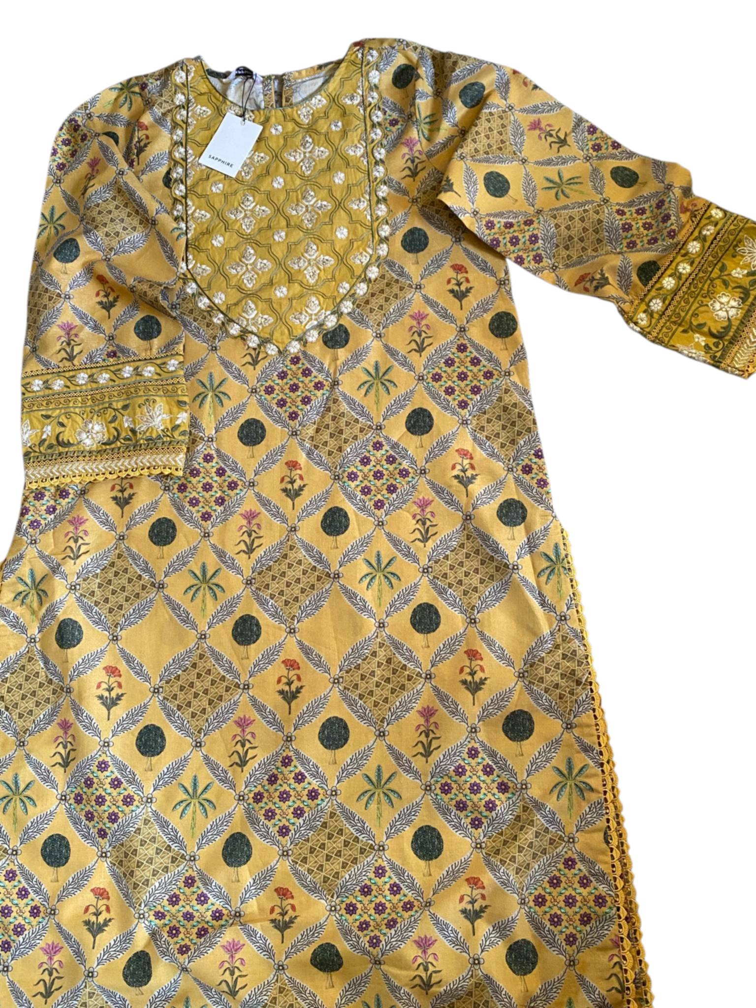 Sapphire Yellow Printed Fancy Cotton Shirt with Embroidered Front & Cambric Culottes – 2 Piece