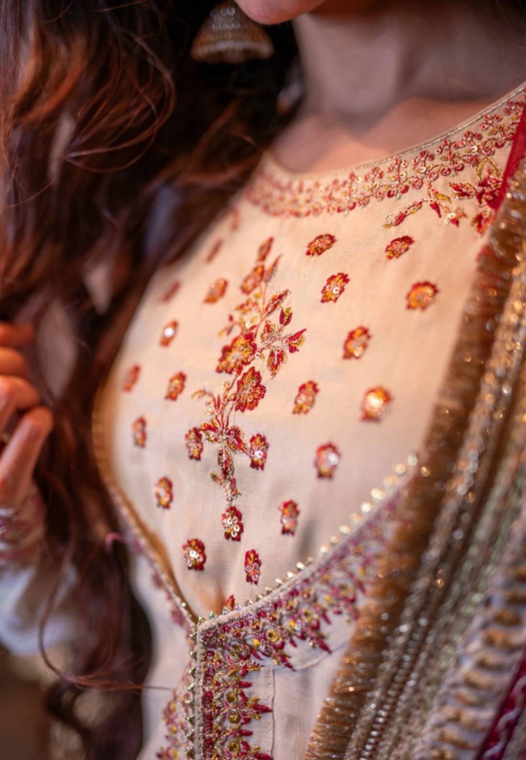 - Dupatta: Organza with woven gold motifs